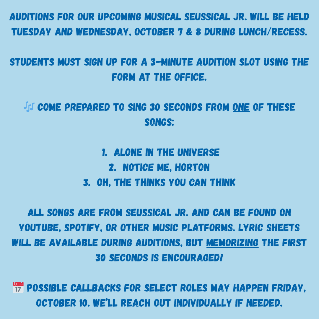 Our upcoming musical, Seussical Jr, will be hosting auditions soon. Please see below for the timing and dates of the auditions: