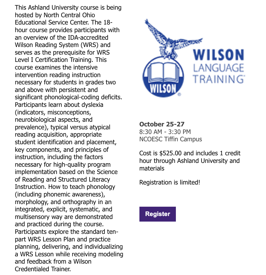 All sessions are held at our NCOESC Tiffin Campus. Graduate credit is available through Ashland University.