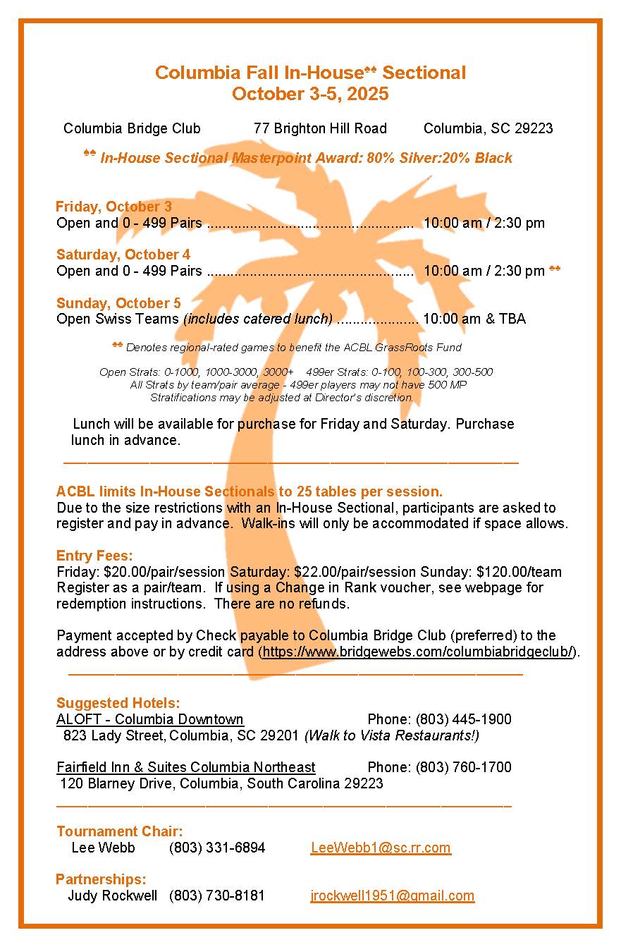 Columbia Bridge Club | 77 Brighton Hill Road www.bridgewebs.com/columbiabridgeclub | Columbia, SC 29223 US