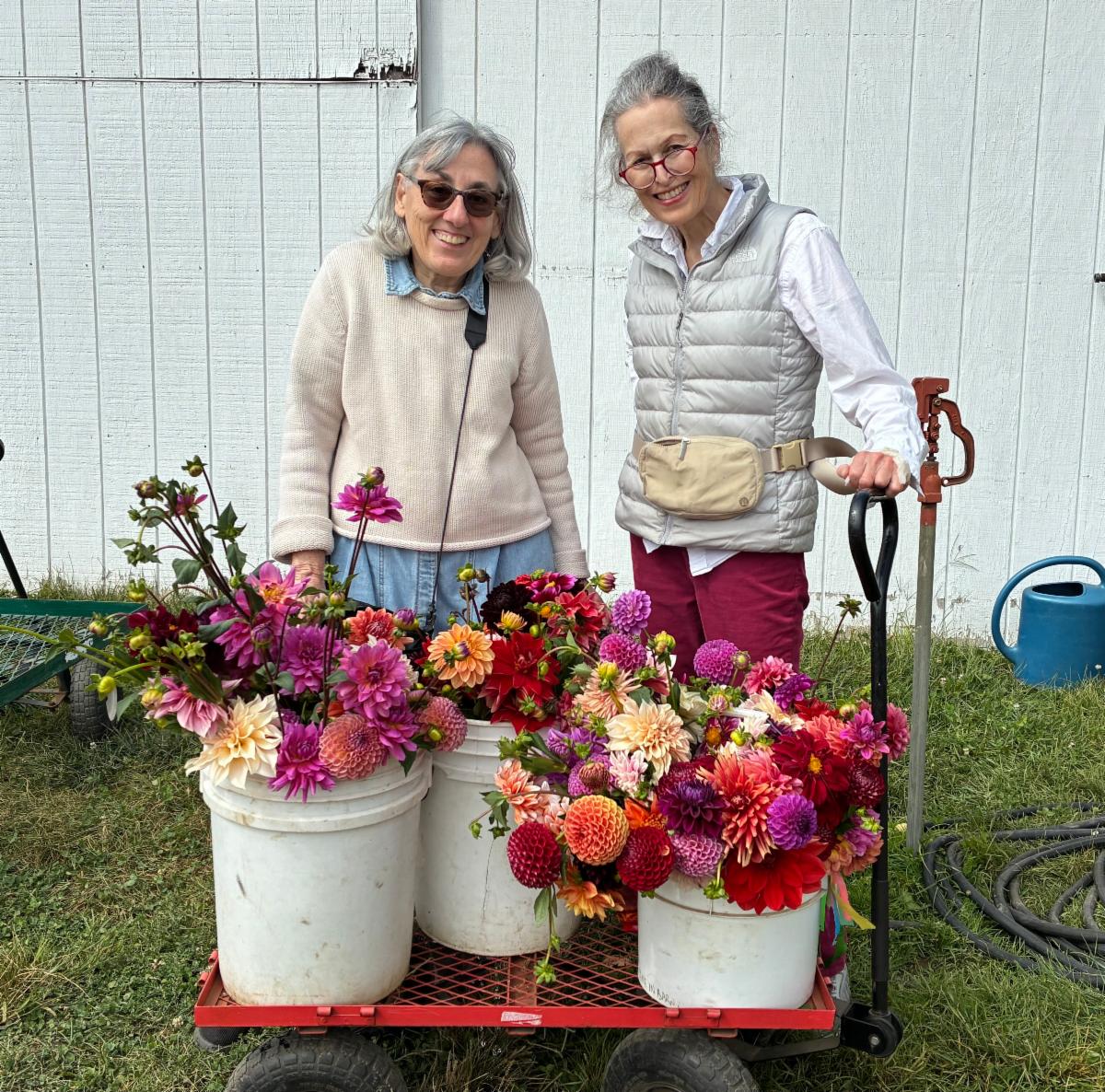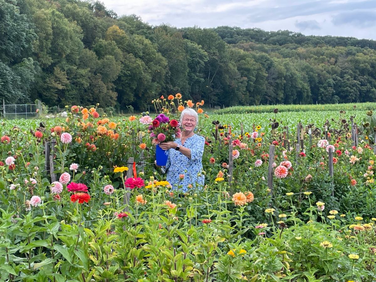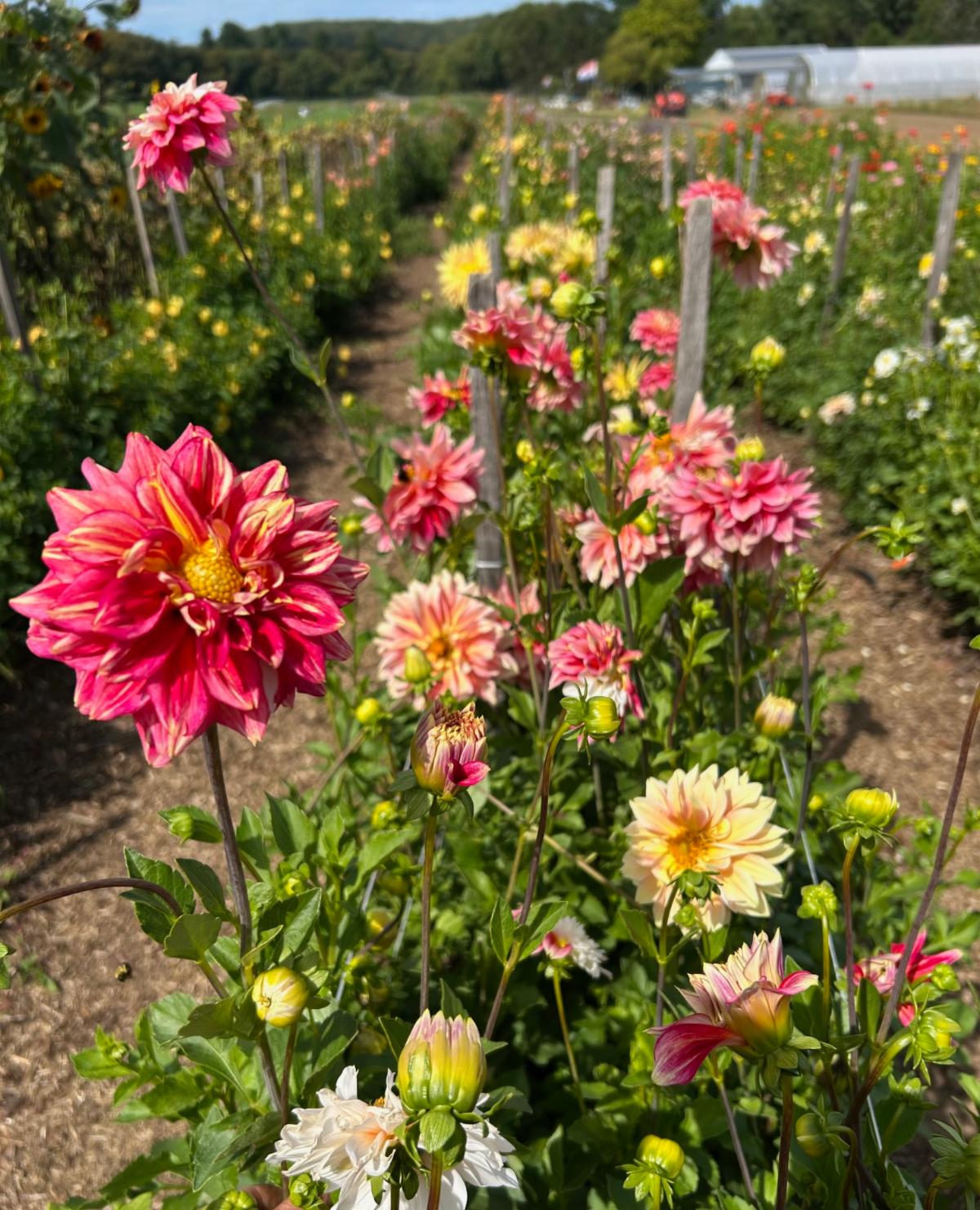 | Margo has been coming to the farm from the very beginning. It's great to see her enjoying the flower patch! | The magic of pollination has always intrigued me, and few years ago, against my better time management judgement, I embarked on a little dahlia breeding adventure to get in on it. When a bee sips nectar from a flower, they dislodge little grains of pollen from the anthers of one flower, then move on and some of that pollen is deposited onto an open stigma of the next flower they visit. This is the first step in the creation of a brand new seed. In the case of dahlias, each individual flower can produce up to 50 viable seeds. And each seed, if it grows into a mature plant, will produce a new, totally unpredictable, unique dahlia flower! | Walking through the patch one is enveloped in a tunnel of riotous beauty and color. It's truly hard to choose just one bouquet. In fact, having to choose just one photo is ridiculous! Here are two ... | I had to see what treasures were hidden in our spent blooms. In 2022 I collected lots of dahlia seeds from our field and have been growing them every year since. Scattered around our field are some of the varieties from that first round. If you walk all the way to the end of the patch, you can see the next trials that grew from seeds saved last fall. | Jane and friends have beautified their tables with bouquets for holiday gatherings for the last two years. Think of how these dahlias can jazz up weddings and other special events ... | |