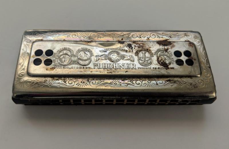 This 2-32 ECHO harmonica, which belonged to Jack, dates back to sometime between 1937 and 1939. The six-pointed star visible in the center, circular medallion held by two hands was a trademark of M. Hohner, a German musical instrument company. By 1939, the Nazi regime had made it clear that any association with traditionally Jewish symbols would result in persecution. Subsequently, Hohner dropped the six-pointed star from its design element."