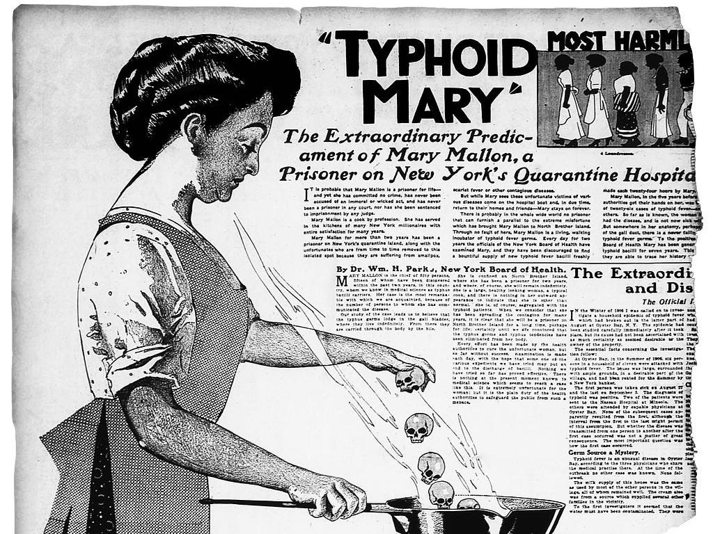 Mary Mallon was skilled at what she did. She was an experienced cook, who managed to work her way into the kitchens of some of New York's most elite homes. She was renowned for her desserts. Her hand made peach ice cream apparently being her most sought-after creation. There was one problem. Mary had typhoid fever. She may have been born infected, but certainly by the time she was an adult her body was riddled with the disease-causing bacteria. Typhoid is a nasty bacterial infection that causes vomiting, diarrhea, high fever, and delirium. Untreated it kills between 10-30% of those infected. There were no antibiotics or other effective treatments during Mary's lifetime, only supportive care. Poor sanitation spreads the disease when fecal matter contaminates food and water. It was a scourge during Mary's day and still kills more the 100k people every year. The cases that followed Mary where strange though. Typhoid generally stalks the poor and crowded districts of cities and other areas where sanitation breaks down, like war zones and prison camps. It had no business in the homes of New York's elite. Mary had a secret which she never acknowledged. She was the first known asymptomatic carrier of the disease. In the pre-germ theory period in which Mary lived hand washing and sanitation were not common. Mary's condition, her job, and her refusal to take precautions against it would prove fatal.