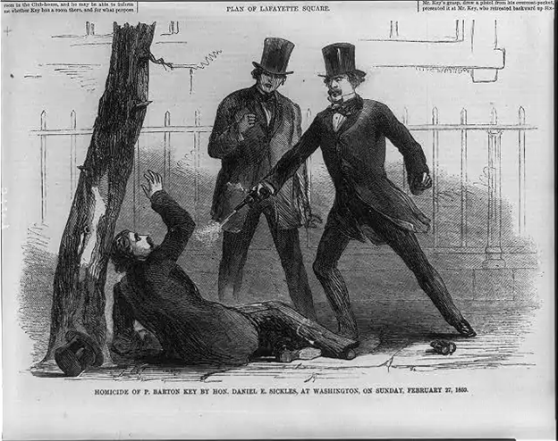 The date is February 27, 1859, and a man strides confidently around Lafayette Park in Washington, D.C. He is in a good mood and hopes to meet his lover for a clandestine rendezvous. He is noted for his good looks, his womanizing ways, and has never had reason to fear walking the streets of the Nation’s Capital. He is the Attorney General of Washington, D.C., a scion of an important family, and well connected with the Capital’s powerbrokers. He makes the prearranged signal by leaving a blue ribbon visible outside the house that he and his lover make use of, and prepares to await her arrival. In the past he would go to a club across the street and await his lover while watching for her with opera glasses. Today, though, he sees someone he did not expect and who he had hoped would be out. His lover’s husband, who is also one of his best friends, comes striding down the street towards him. He is slow to sense the danger and extends his hand to great his friend; one must keep up appearances after all. What he does not know is that the affair is no longer a secret and that he is about to die. His friend, a first term congressman from New York, screams “[y]ou have dishonored my home and family” while reaching into his pocket and drawing a pistol. The man reaches into his own coat, but his pocket contains only the opera glasses. His friend fires 3 times at point blank range, including once while after the man has dropped to one knee. The man’s name is Phillip Barton Key II, and his story is over. His killer and former friend is Daniel Sickles and his story only gets more interesting.