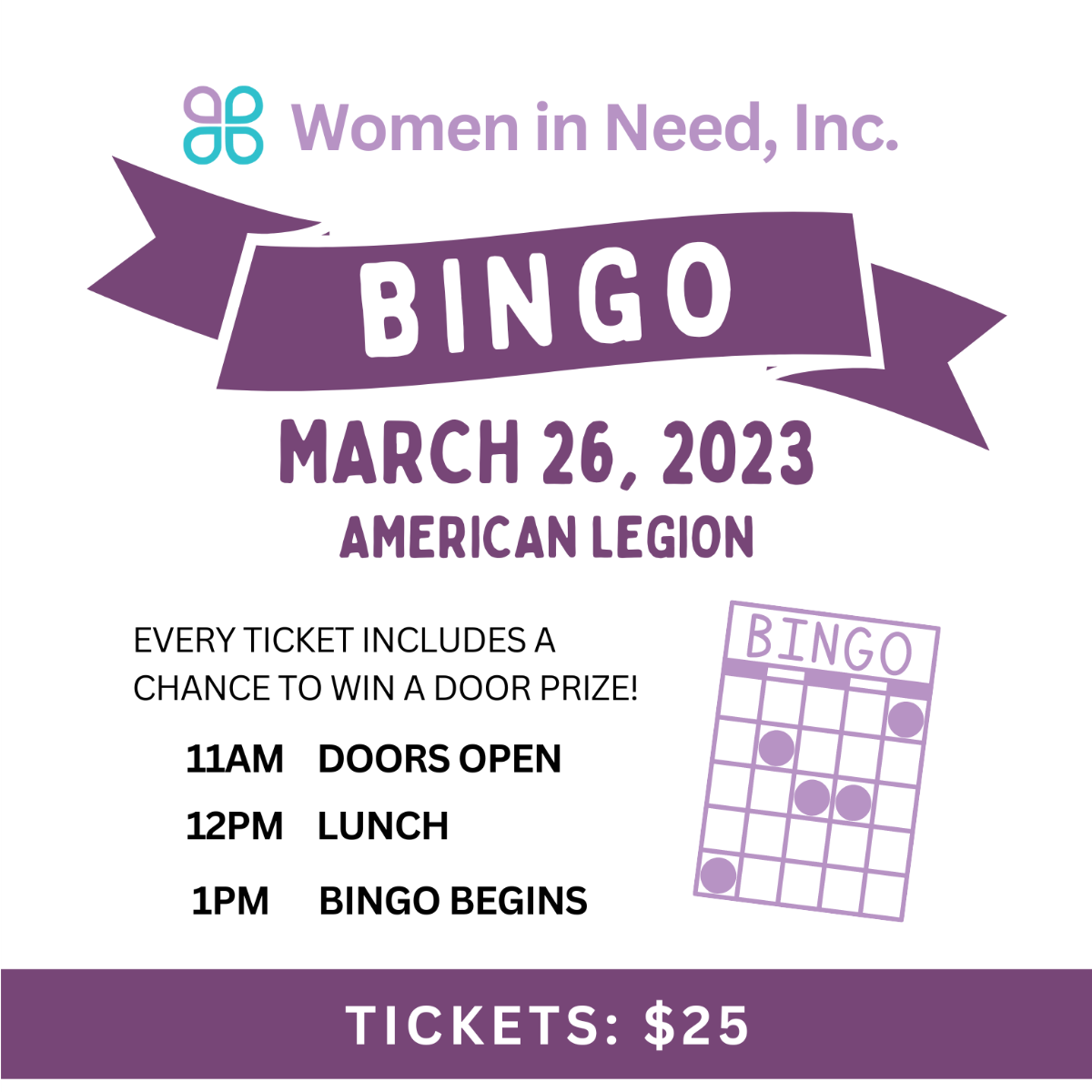 Join us for a fun afternoon with lunch, bingo games, fishbowl tickets, and a door prize drawing at the American Legion. All proceeds benefit WIN (Women in Need).