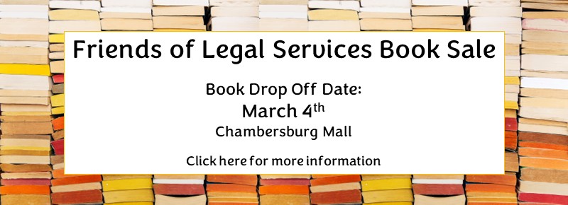 The second of this year’s Book Drop-Off Days for the Friends of Legal Services Book Sale will take place this Saturday, March 4th, from 9AM to 1PM at the Chambersburg Mall. Follow the signs through the Mall parking lot and bring us your new and used books, CDs (including audio books), DVDs, sheet music, puzzles, and board games. Your books will bring joy to other readers, and the sale proceeds will help provide legal services in civil cases to low-income families in our area. Receipts for tax purposes will be available on request. The group does not accept encyclopedias, textbooks, or phonograph records.