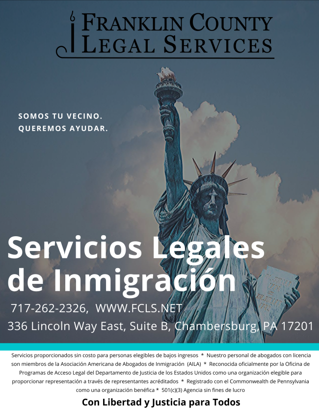 Franklin County Legal Services is currently conducting outreach for its immigration legal services for low-income individuals. If you know of someone who would benefit, please refer them to Franklin County Legal Services. Please see the the attached flyers in English and Spanish. In addition to the practice of immigration law, Franklin County Legal Services continues to provide access to legal help for all types of civil legal problems. Thank you for informing individuals in need about our services.