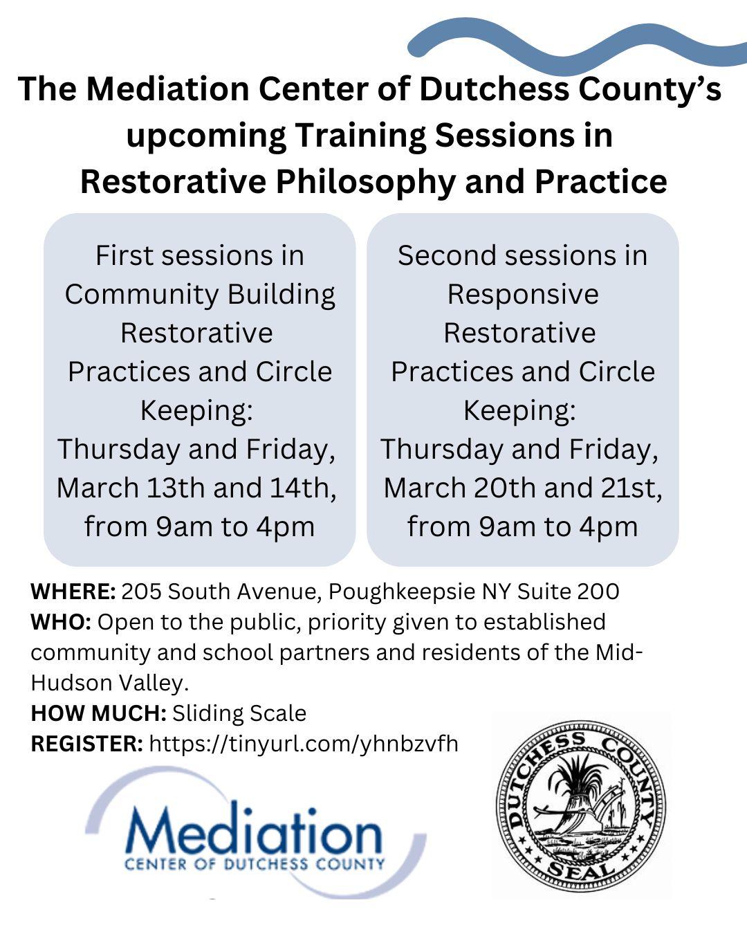 The Mediation Center of Dutchess County is a small non-profit and your contribution enables us to continue prioritizing access to this work within our broad communities. We trust that participants will give generously within their means. Thank you and we look forward to meeting you!