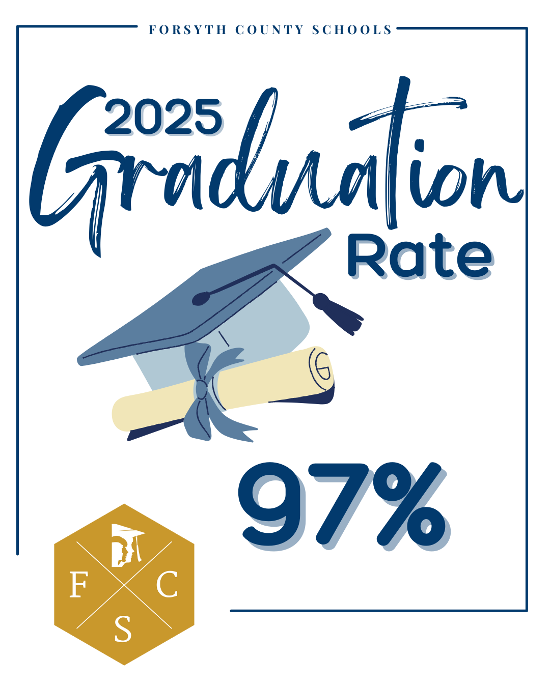 Forsyth County Schools achieved a 97% graduation rate for the 2025 graduating class. We are so proud of our students, our staff, and our families for this remarkable accomplishment. To learn more about this achievement and to see individual high school graduation rates, click here: https://ow.ly/2i4g50X3X4v