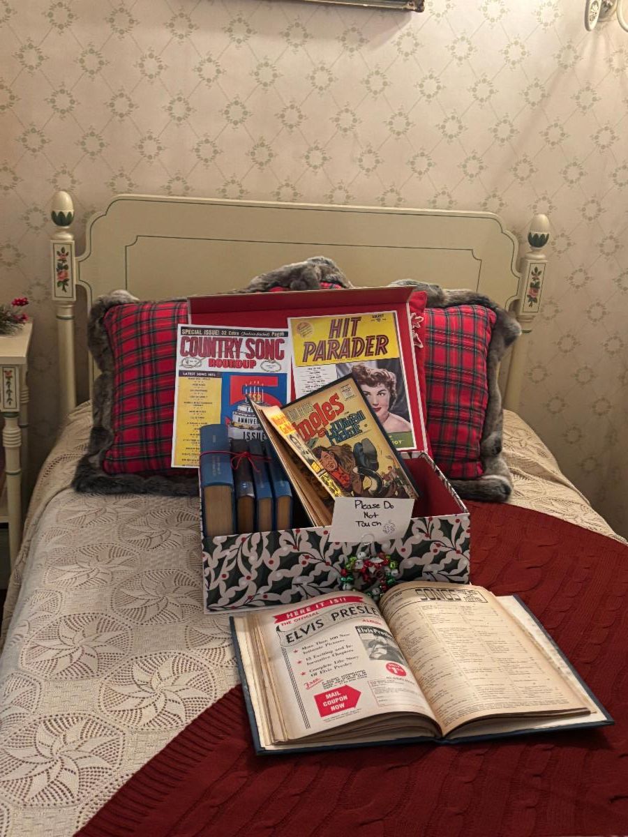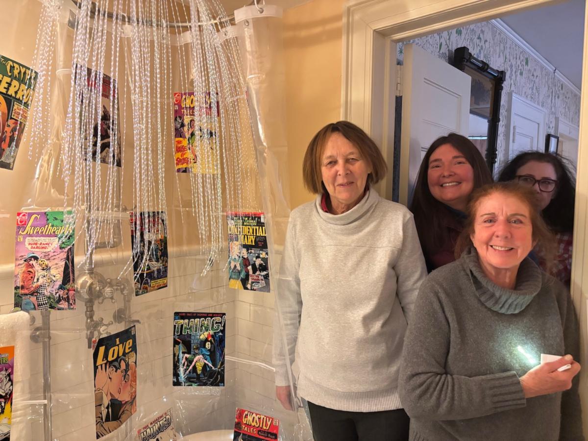 The Osborne Homestead Museum in Derby hosted holiday tours of Frances Osborne Kellogg's home from November 28 through December 20. Garden Clubs in the area volunteered to decorate different rooms in the Museum before the tours began. This year's subject was "Businesses that began in Derby." Mary Ann Tyma, Mary Leigh Sabshin, Debbie Schlegel, Cindy Marien, Mary Jane Purcell, Teresa Gagliardi and Angela Bradley, members of the Garden Club of Woodbridge, decorated Frances's childhood bedroom and bathroom. The business the club members were assigned was Charlton Comics, an American comic book publishing company established in Derby from 1945-1986. Its first publications were song lyrics, puzzles and books. Charlton Comics had crime, science fiction, Western, horror, war, and romance comics, as well as talking animal and superhero titles. Numerous items from the comic book era, books with song lyrics, and old photos enriched Frances's bedroom and bathroom.