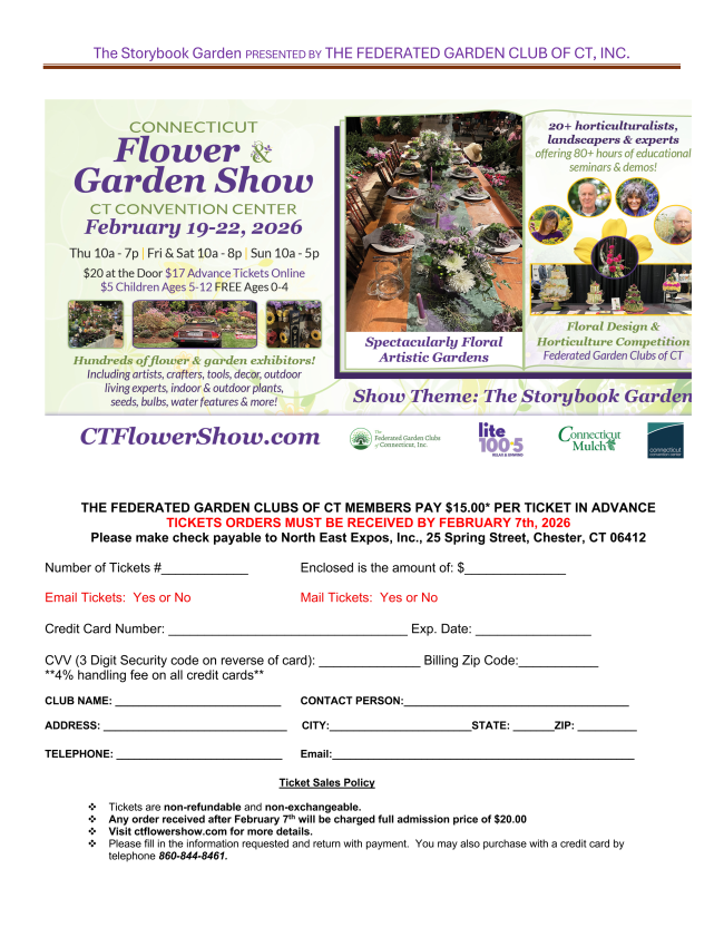 I hope you have your calendar marked for the Connecticut Flower and Garden Show – “A Storybook Garden – It’s Where Our Story Happens” February 19-22 at the CT Convention Center in Hartford. It’s going to be amazing!! You can still register your Horticulture until Feb. 8 – and remember there’s no penalty if you choose not to bring it. The Schedule and Online Registration is on our website. Discounted tickets for our members are available until Feb. 7 HERE .