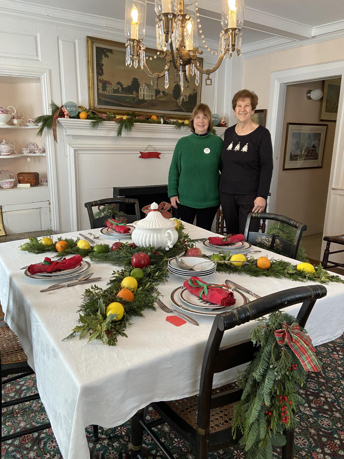 Pictured are Mitzi Romano, President of the Cheshire Historical Society and Jan Edwards, member of the Society and on the Suburban Garden Club decorating team in the dining room.