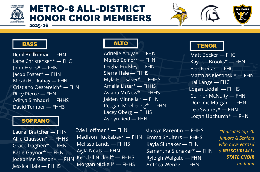 Nearly 200 singers from throughout Missouri are selected each year to perform with the prestigious ensemble. Seventeen juniors and seniors from Francis Howell North ranked in the top 20 and earned the right to audition for the Missouri All-State Choir on November 6. Francis Howell Central will have four students advancing, and Francis Howell High will have nine.