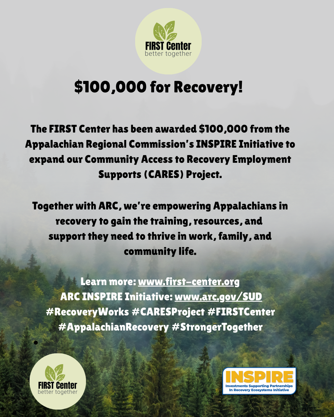 Huntingdon, PA (September 23, 2025) The FIRST Center has been awarded $100,000 by the Appalachian Regional Commission (ARC) to build and expand recovery-to-work supports in Huntingdon, Mifflin, Juniata, Bedford, and Fulton Counties. The project is part of an $11 million award package through ARC's Investments Supporting Partnerships in Recovery Ecosystems (INSPIRE) Initiative. INSPIRE addresses workforce gaps and economic challenges due to the impact of substance use disorder (SUD) in Appalachia.