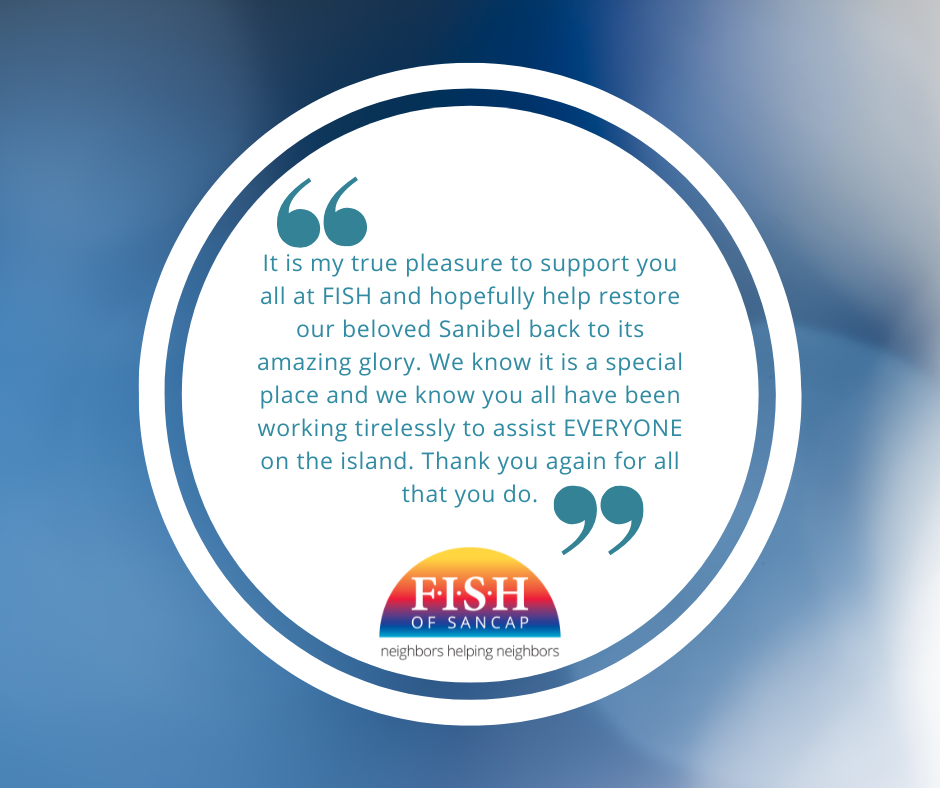 Welcome 2023! While the last quarter of 2022 was nothing anyone expected, FISH has continued to serve our island communities in ways we never imagined! Thank you to all of our supporters, volunteers, partners and advocates for always being there for us and for allowing our team to do what we do best -- enrich the lives of all people in Sanibel and Captiva Islands by neighbors helping neighbors with social services, education and assistance. We hope you’ll enjoy the following photos highlighting our services and celebrations during the last quarter of 2022.
