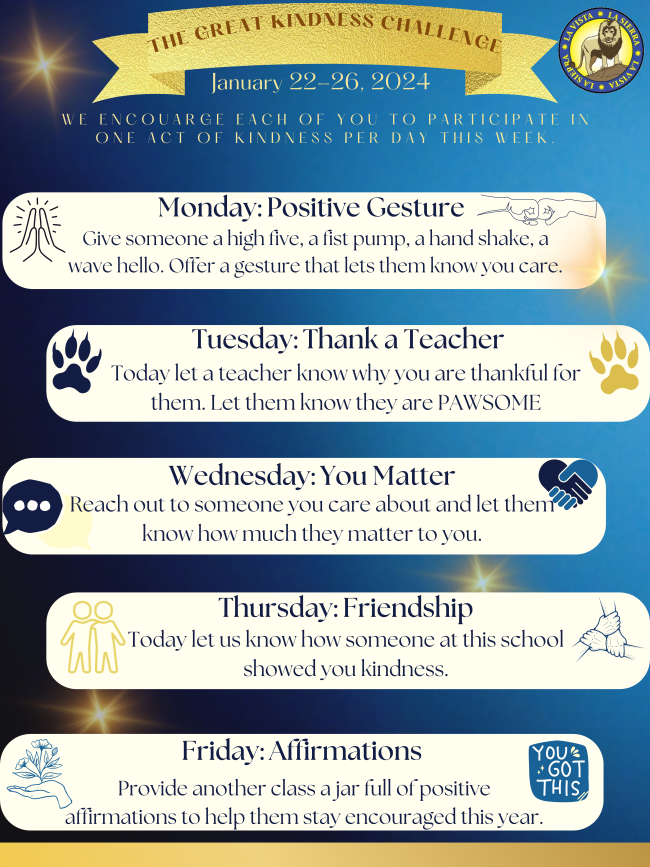 FJUHSD encourages everyone to join in on the The Great Kindness Challenge. Below are a few ways that our schools will be participating during the week.
