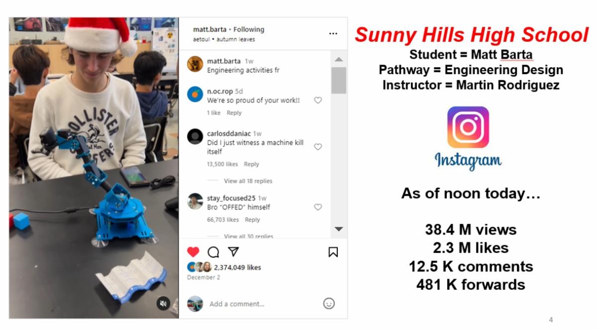SHHS student Matthew Barta is a junior at SHHS in the EPIC Engineering Program. The class has been building and programming robotic arms in class. The video was posted on Computer Science Education (CSE) Day and ended up getting 38.4 Million views. Student Matthew Barta really enjoys his Principles of Engineering class and states, “I truly enjoy Mr. Rodriguez’s class. I feel like it completely encompasses all of the knowledge and skills I will need to use to continue on my engineering career path. Out of every class, every day I look forward to his the most."