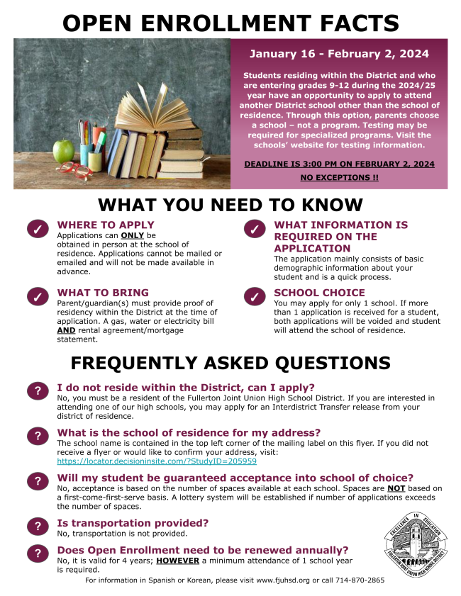 Open Enrollment will be open to students who live within the FJUHSD boundaries.