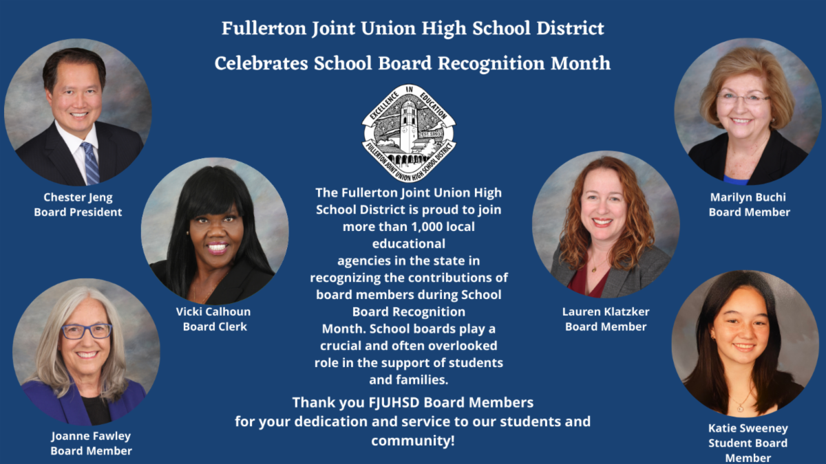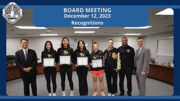At the December Board Meeting, the Board celebrated fall athletic teams who reached CIF finals or State qualifiers. Girls’ Golf, Tennis, and Volleyball were recognized. New Board President Chester Jeng was elected, outgoing president Joanne Fawley was thanked for her service, and Board Member Marilyn Buchi was recognized for 40 years of service! In addition, new Student Board Member Katie Sweeney and SAC Vice Chair Grace Nevis were sworn in. Congratulations to all!