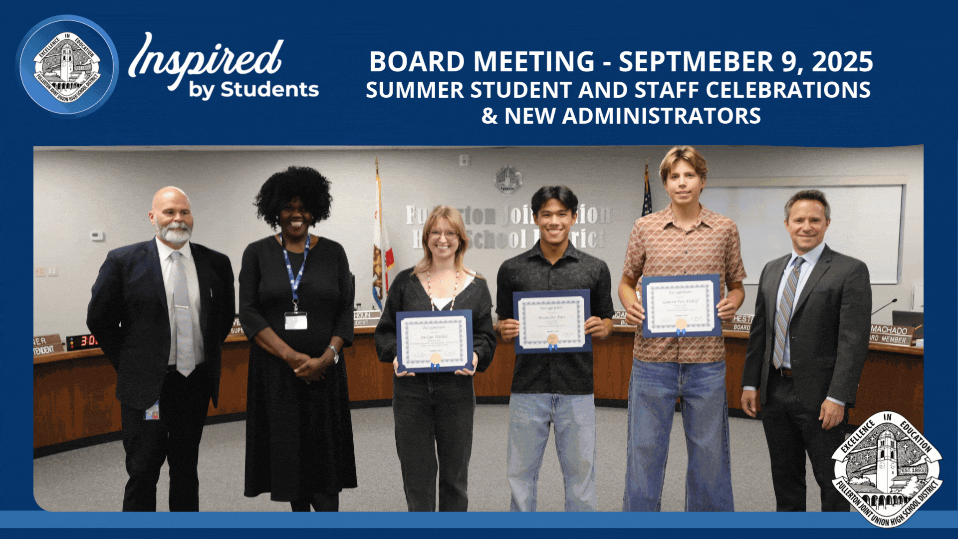 At the September 9, 2025 Board of Trustees meeting, we celebrated the outstanding achievements of our students and staff. Honorees were recognized for awards and accomplishments earned over the summer months, reflecting their hard work, dedication, and success. We also welcomed our newly appointed administrators to the FJUHSD team. Their leadership and commitment will help continue to inspire and support our school communities. Please join us in congratulating all of those recognized and in giving a warm welcome to our new administrators!