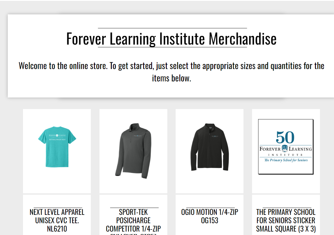 Forever Learning Institute hosts an online store where you can purchase t-shirts and jackets with our logo. Show all your friends your love of lifelong learning!