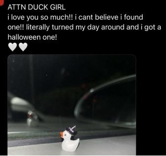 “To the duck girl…I hope you have a great day. I haven’t found a duck yet, but I know if I do my day and week will be so much better. Thank you for spreading happiness on campus. You never know what people are going through.”