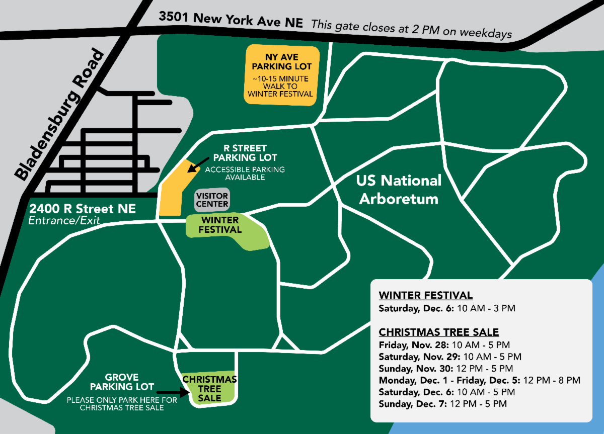 - Both the R Street entrance (2400 R Street NE) and the New York Avenue entrance (3501 New York Avenue NE) will be open for this event. Use either gate to enter the Arboretum.