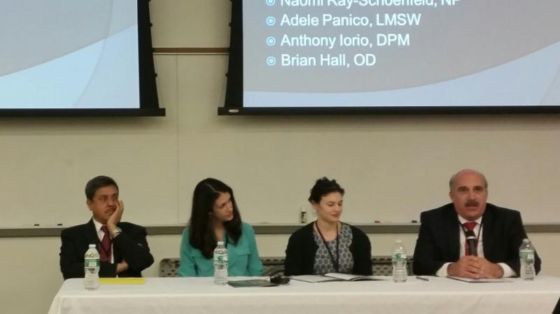 left to right: Ramanathan Raju, MD, MBA, President/CEO of the NYCHHC; Adele Panico, LMSW; Naomi Ray-Schoenfeld, NP; Anthony Iorio, DPM ('81), MPH.