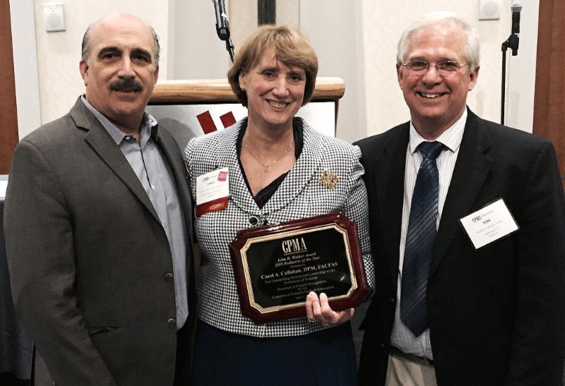 | Carol Callahan, DPM ('83) Honored by CPMA Carol Callahan, DPM, a 1983 graduate of the New York College of Podiatric Medicine and former President of the CPMA (2007), received the John D. Walker Award for Outstanding Podiatrist of the Year at the Connecticut Podiatric Medical Association Annual Award and Installation of Officers for the 2015-16 year on April 11-12. She is congratulated by two other NYCPM alumni: left, Anthony Iorio, DPM ('81), MPH, Associate Professor and Chair, Department of Community Health and Medicine, Assistant Dean for Continuing Medical Education at NYCPM, and right, by CPMA's Immediate Past President Thomas V. Johnson, DPM ('83). |