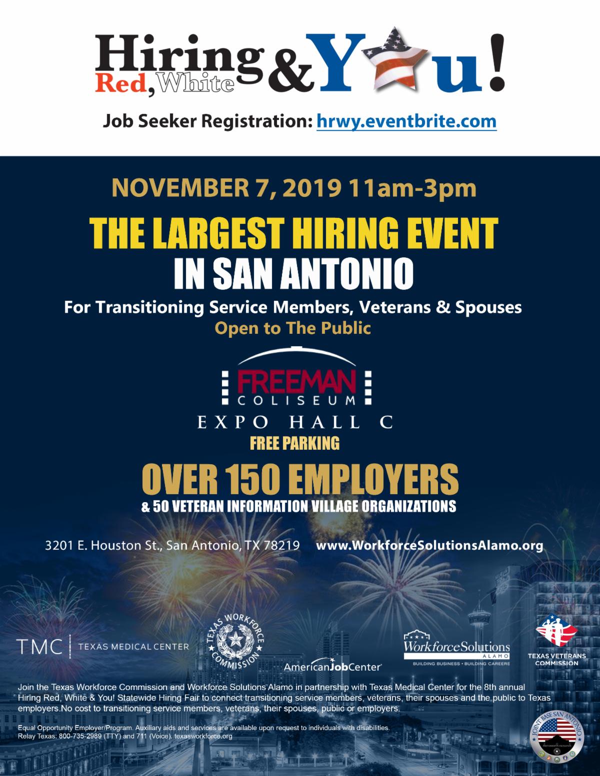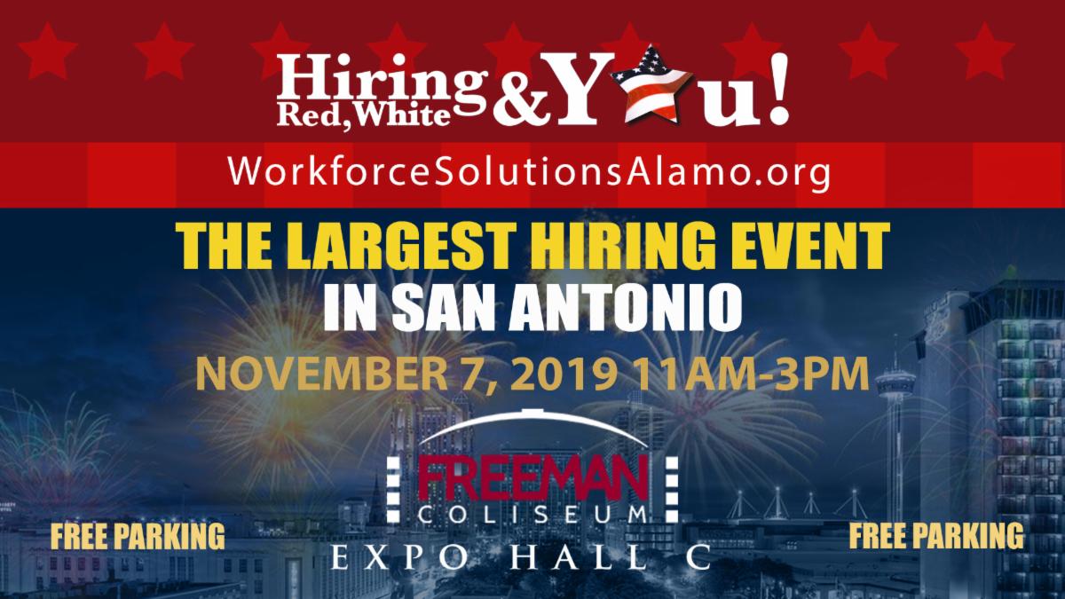 On November 7, 2019, Workforce Solutions Alamo, in partnership with the Texas Workforce Commission, the Texas Veterans Commission, the Texas Medical Center, and Governor Abbott, is hosting its 8th annual statewide Hiring Red, White and You! (HRWY) job fair. The job fair will be held November 7th from 11 a.m. to 3 p.m. at the Freeman Coliseum Expo Hall C, located at 3201 E. Houston Street in San Antonio, Texas.
