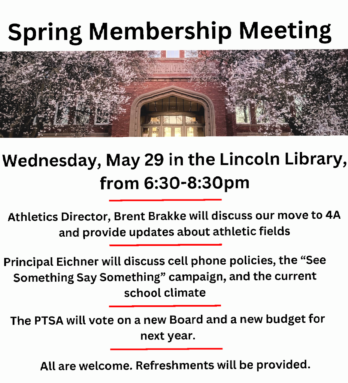 We’d like to invite parents of next year's Freshman to our Spring Membership Meeting on May 29, 6:30-8:30pm. There is an optional Zoom Link. All questions are welcome. It is an early opportunity to learn more about how you can be a part of Lincoln High School PTSA next year!