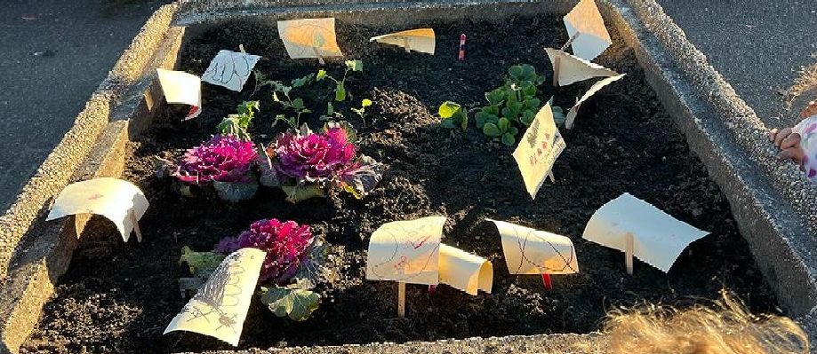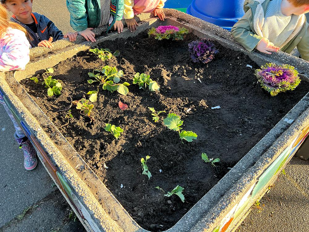 Members of Gabi's kindergarten class work on planting cabbage & garlic on the playground!