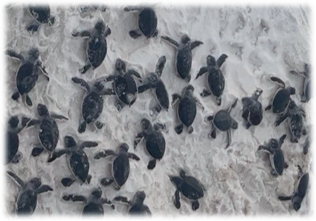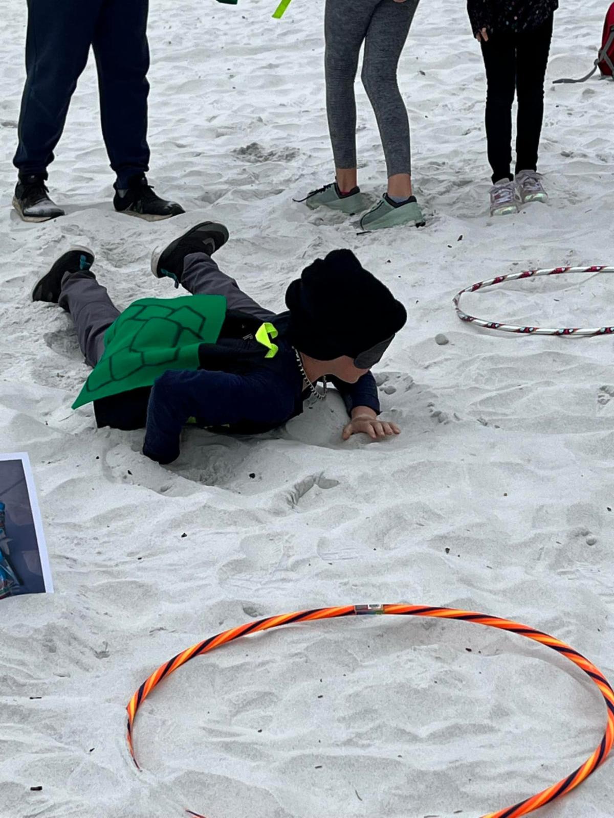 Weather permitting, the fourth activity is a field trip to the beach. During this activity, the students are split into three groups. In one group, students simulate a female turtle digging a nest using strokes that resemble digging by the mother turtle's fin. In a second group, students don a backpack filled with golf balls and belly-crawl on the sand through an obstacle course to simulate the mother turtle's trek to her nesting place. For this exercise, the students are blindfolded to experience a mother turtle's journey from the sea to the dunes in the darkness of night. The third group walks the beach with a VBA who emphasizes the need for beaches to be #CleanDarkFlat. Everyone in this third group picks up any trash and fills in any holes that they find.