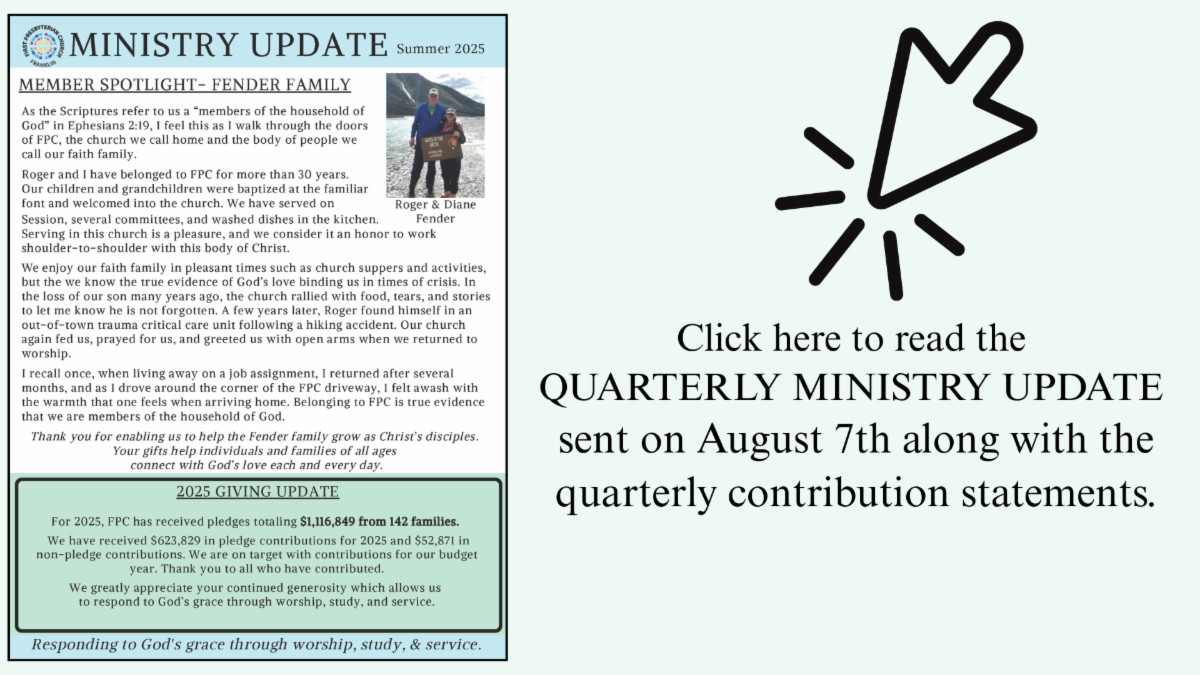 We invite the whole congregation to come enjoy a delicious home-cooked meal, hear about the impactful trips that FPC Youth went on this summer, and consider donating to fund our efforts for the summer of 2026.