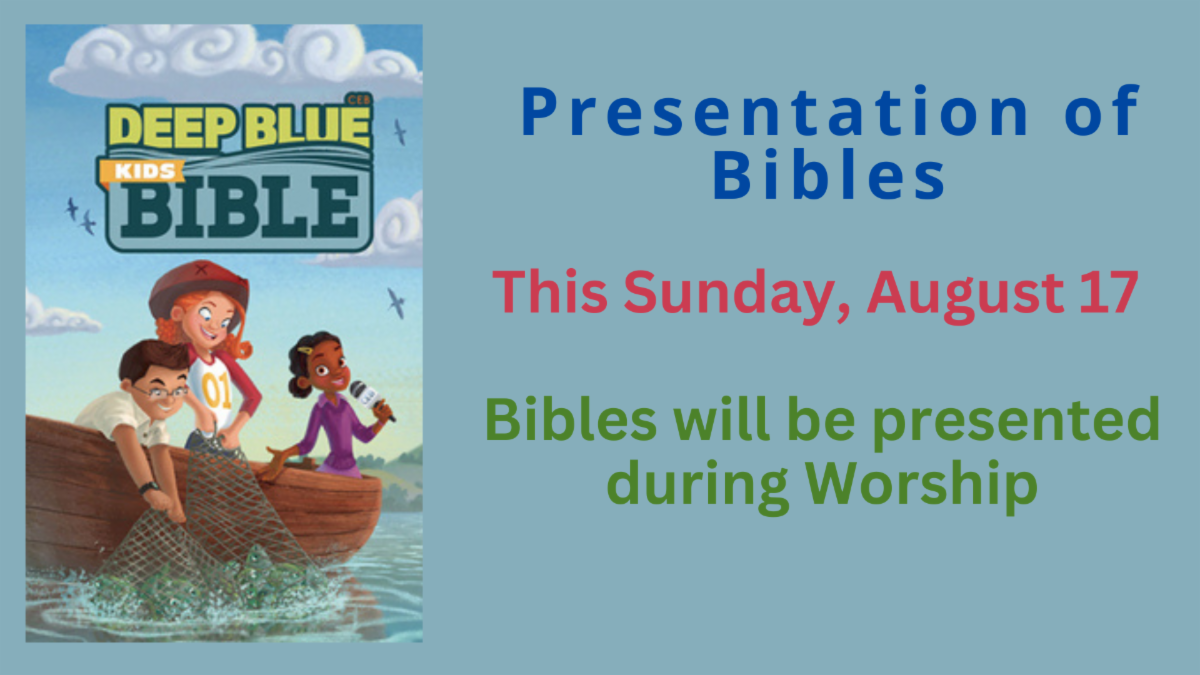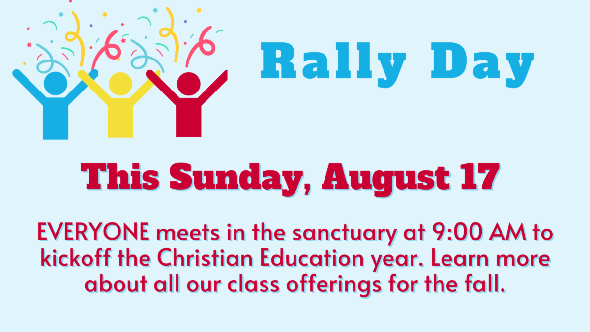 Rally Day is this Sunday, August 17! All ages are invited to join us in the sanctuary at 9 AM to kickoff the Christian Education year and learn about our Sunday School offerings. In worship that day, we will present our upper elementary students with a Deep Blue Kids' Bible, so if you have a kid (rising 3rd grade through 5th grade) who hasn't received that Bible and would like to, please email Sam Belcher.