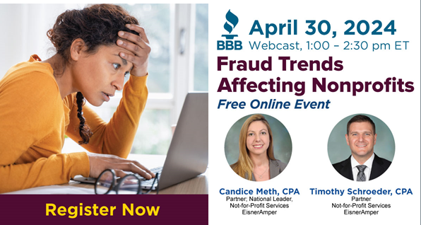 Calling all Nonprofit executive directors and CEOs, board members, CFOs and other financial officers, COOs, development officers, program officers, nonprofit advisors, and other interested executives. Join BBB for a free online webinar to discuss fraud trends affecting nonprofits on April 30th, 2024 from 1-2:30PM. Knowledge is power when it comes to protecting your organization against fraud attempts. From banking-related scams to cybersecurity threats, nonprofits must continuously adapt internal controls to ward off bad actors.
