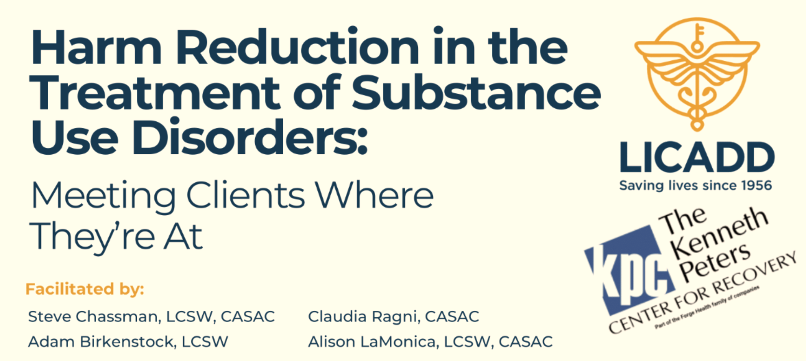 Join Long Island Council on Alcohol and Drug Dependence Inc. (LICADD) for an interactive and informative workshop about the use of harm reduction in the treatment of substance use disorders (SUDs), on Friday April 26th, 2024 from 1PM-4PM at the KPC Center for Recovery (6800 Jericho Turnpike, Suite 112W, Syosset, NY 11791).