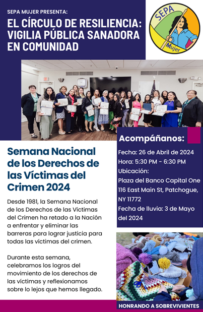 Join Sepa Mujer for The Circle of Resilience: Healing Together Public Vigil on April 26th, 2024 from 5:30PM-6:30PM at Capital One Bank Plaza, 116 East Main Street Patchogue, NY 11772. (Rain date: May 3rd, 2024)