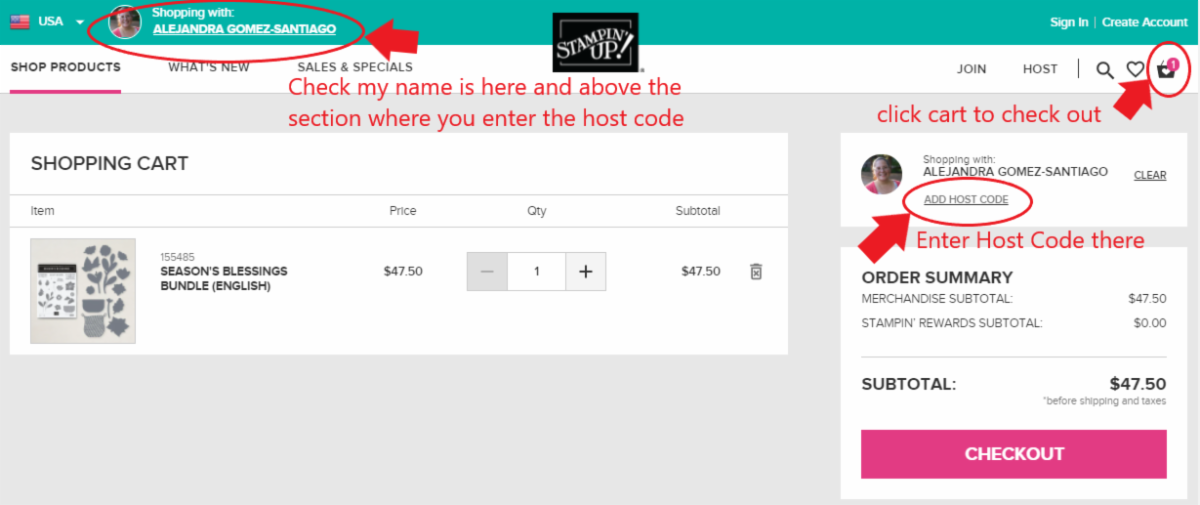 Please make sure you are shopping with Alejandra Gomez and make sure to enter the host code 76FYKC7M (see below picture).