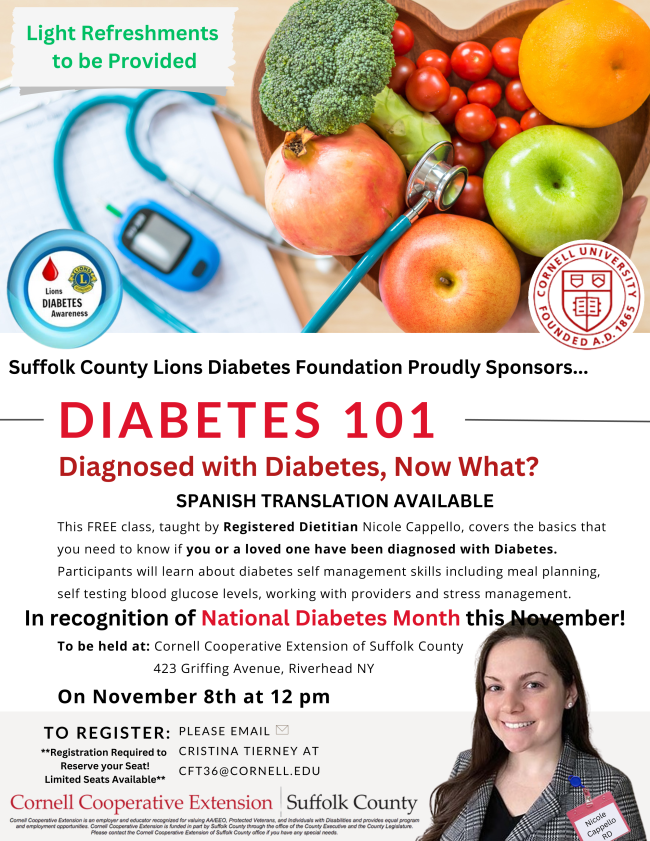 Join the Cornell Cooperative Extension of Suffolk County for a FREE Diabetes Community Education Workshop, on November 8th, 2024 at 12PM. Diabetes 101: Diagnosed with Diabetes, Now What?, is a class that will cover the basics that you need to know if you or a loved one were diagnosed with Diabetes. Participants will learn about diabetes as well as self-management skills including meal planning, self-testing blood glucose levels, working with providers, and stress management.
