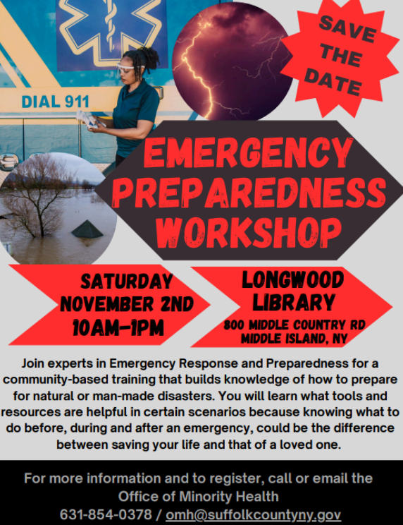 The training will take place on Saturday November 2nd, 2024 from 10AM-1PM at Longwood Library located at 800 Middle Country Road, Middle Island NY. For more information and to register, call or email the Office of Minority Health