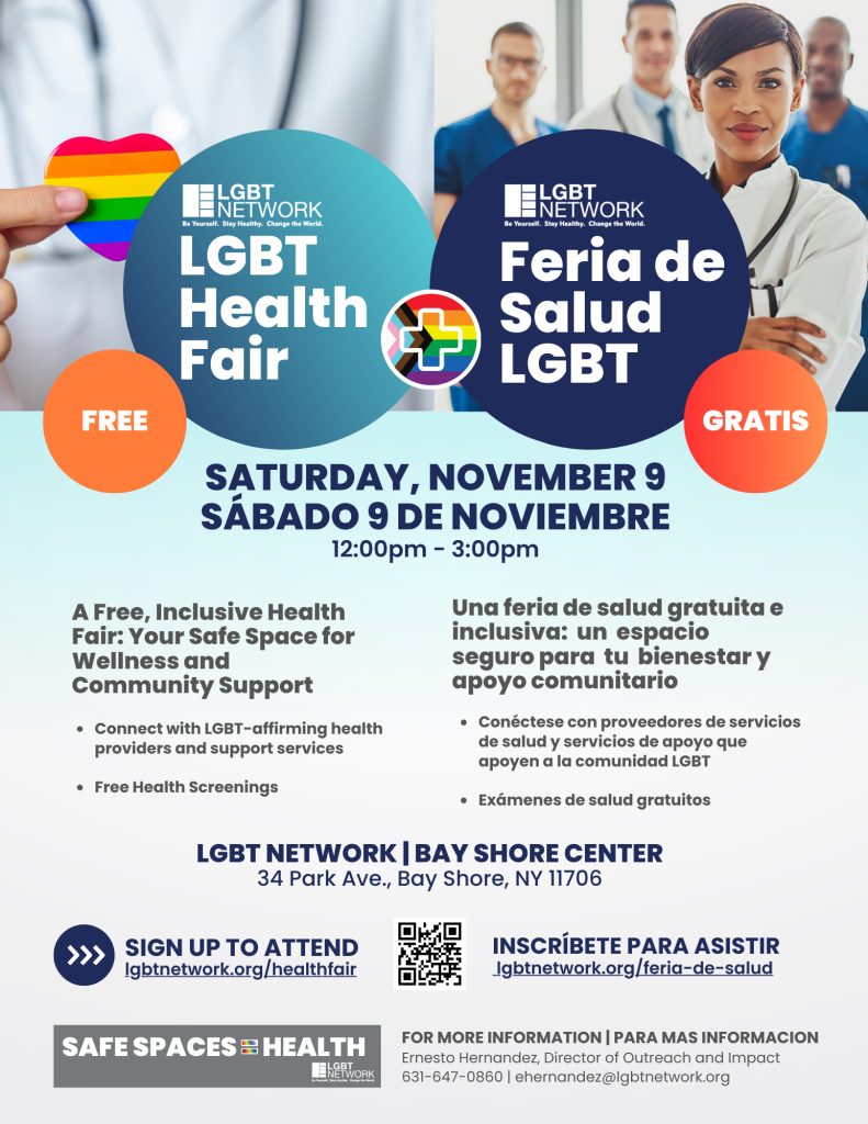 Please join LGBT Network for an LGBT Health Fair on Saturday, November 9th from 12PM-4PM at the LGBT Network Bay Shore Center located at 34 Park Ave. Bay Shore NY 11706. This free event is open to all individuals and families seeking to learn more about health and wellness resources available to the LGBT community. Explore a wide range of services including sexual health testing, mental health counseling, wellness screenings, and information on LGBT-affirming healthcare providers. Attendees will also have the opportunity to connect with local organizations offering support for physical, emotional, and social well-being. Additionally, receive free giveaways, and chances to win exciting raffle prizes!