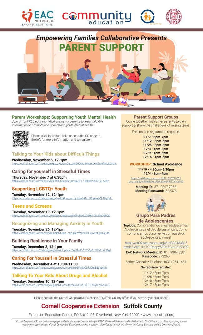 Cornell Cooperative Extension of Suffolk County is hosting Parent workshops and parent support groups. Come together with other parents to learn valuable information to promote and understand youth mental health, and gain support & share the challenges of raising teens. This is free and no registration is required.