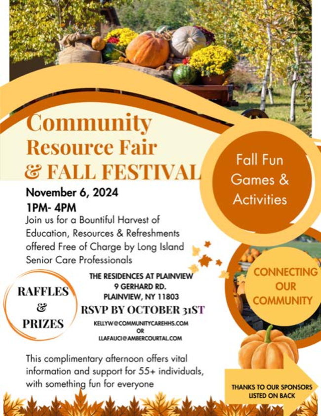 Join ADRC for a bountiful harvest of education, resources, and refreshments offered free of charge by Long Island Senior Care Professionals, on November 6th from 1-4PM at the Residences at Plainview (9 Gerhard Rd., Plainview NY 11803). This complimentary afternoon offers vital information and support for 55+ individuals with something fun for everyone. You must RSVP by October 31st to kellyw@communitycarehhs.com or llafauci@ambercourtal.com.