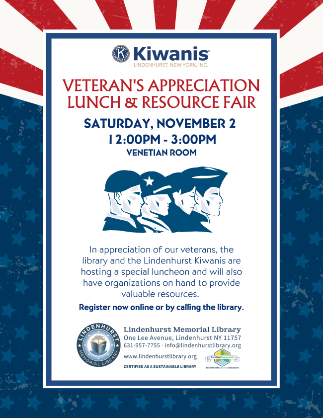 In appreciation of our veterans, the library and Lindenhurst Kiwanis are hosting a special luncheon and will also have organizations on hand to provide valuable resources. Register now online or by calling the library.