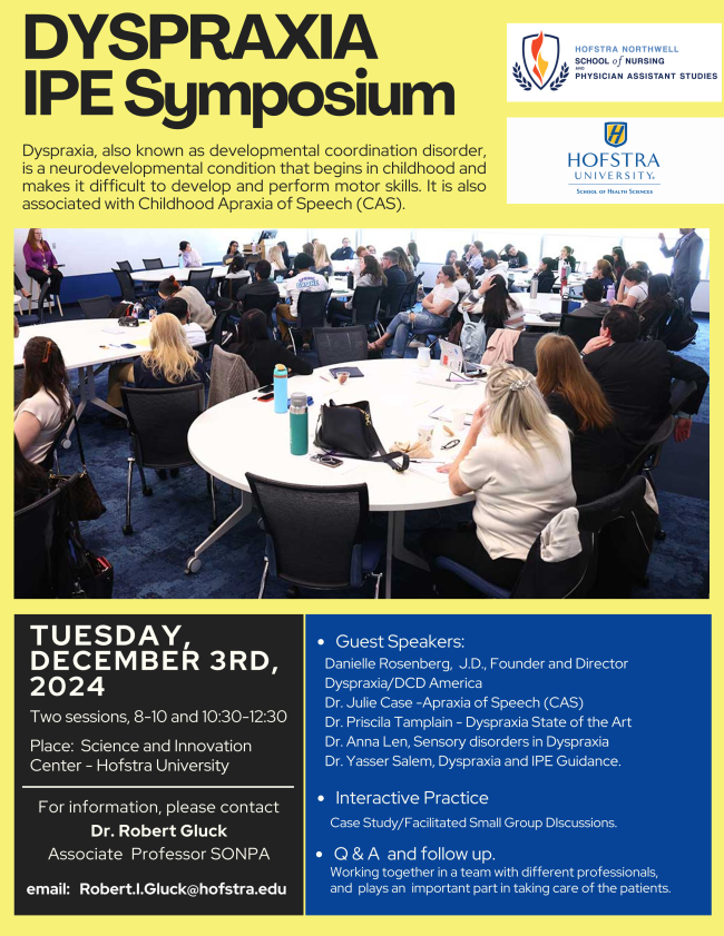Hofstra University's School of Nursing and Physician Assistant Studies is hosting a symposium on Dyspraxia on Tuesday December 3rd, 2024. Dyspraxia, also known as developmental coordination disorder, is a neurodevelopmental condition that begins in childhood and makes it difficult to develop and perform motor skills. It is also associated with Childhood Apraxia of Speech (CAS).