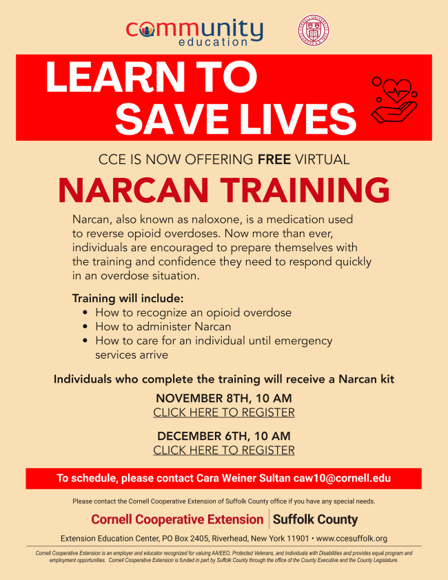 To Cornell Cooperative Extension is now offering FREE Narcan Training. Trainings will include how to recognize an opioid overdose, how to administer Narcan, how to care for an individual until emergency services arrive. Individuals who complete the training will receive a Narcan kit. To schedule, please contact Cara Weiner Sultan at caw10@cornell.edu.