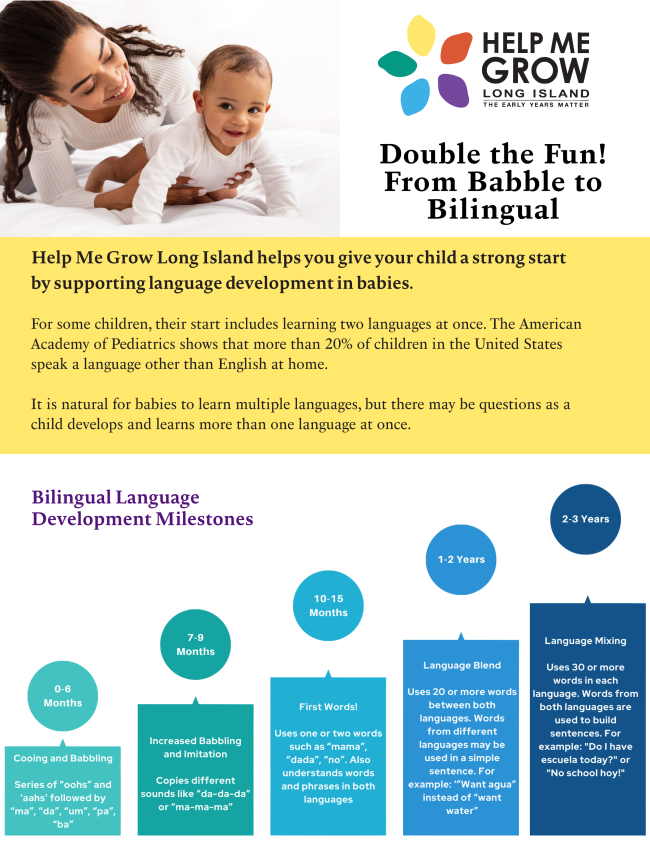 Help Me Grow Long Island has developed the Bilingual Learners Sheet. This resource offers tips on developmental milestones, the benefits of learning multiple languages, and answers to some common questions.