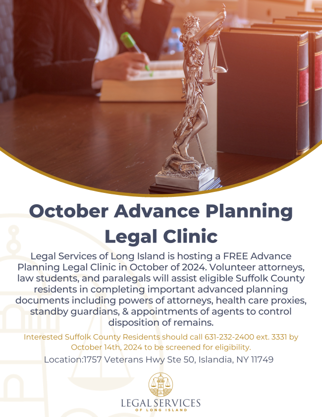 In Suffolk County, our Suffolk County Pro Bono Project is teaming up with volunteer attorneys and law students to provide eligible low-income Suffolk County residents with important advance planning documents including powers of attorney, health care proxies, standby guardians, and appointments of agents to control dispositions of remains. Spread the word by downloading our flyer.