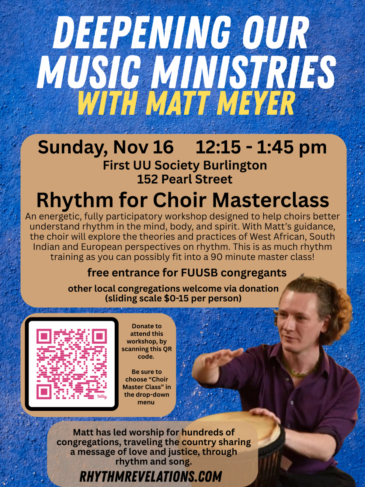 I also wanted to let everyone know about a great event for singers next month. Matt Meyer will be leading the music at our worship service on November 16th, and will be presenting a workshop from 12:15-1:45 on rhythm for choir. This event is FREE to FUUSB congregants and is open to the general public with a suggested donation of $15.