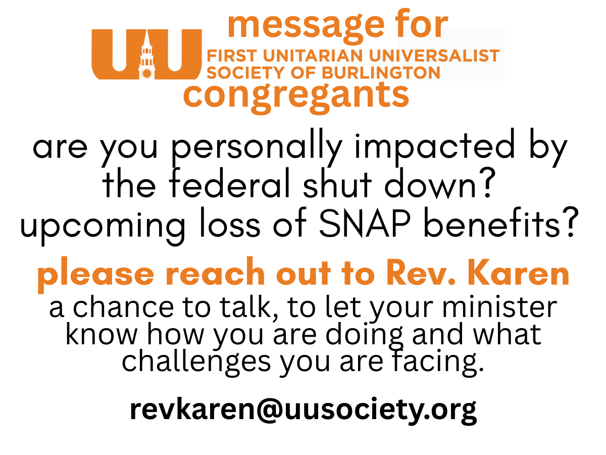 The next Board meeting is scheduled for Tuesday, November 18 at 4:00 pm in the parlors. A Zoom link will be posted on Community Messenger on that Tuesday. Please email board@uusociety.org with any questions.